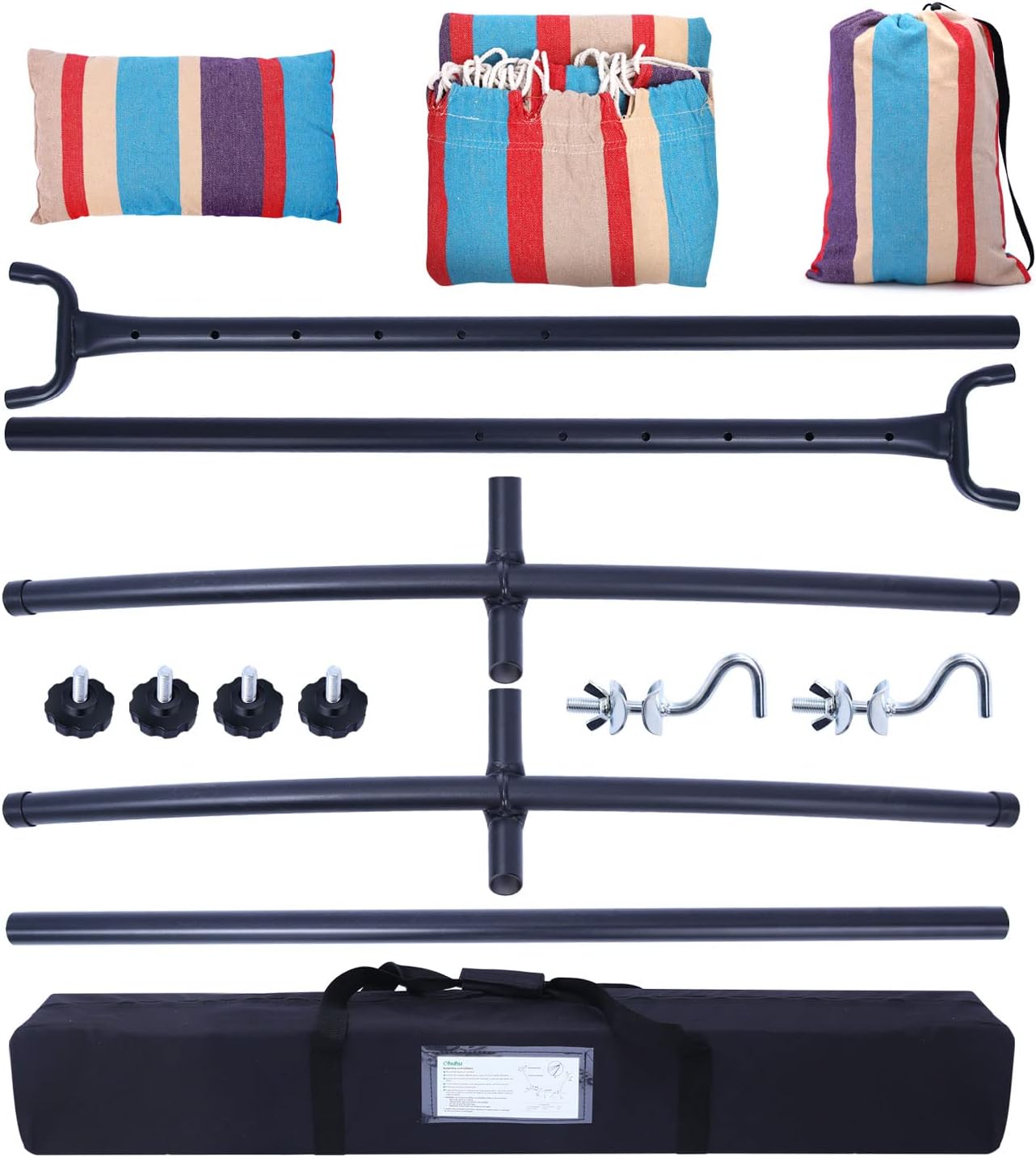 Image: All components of the Ohuhu Double Hammock with Stand, including the hammock, stand parts, pillow, and carrying bag.