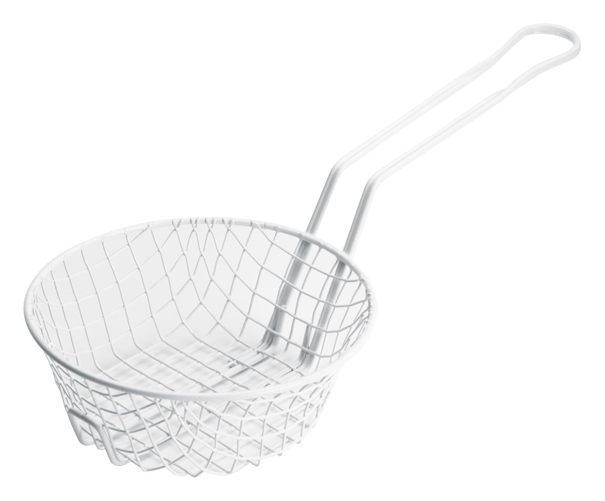 The Winco MSBW-08 Breading Basket is designed for efficient breading tasks in both commercial and home kitchens. It features a durable steel wire construction with a non-stick white plastic coating and a coarse mesh design.