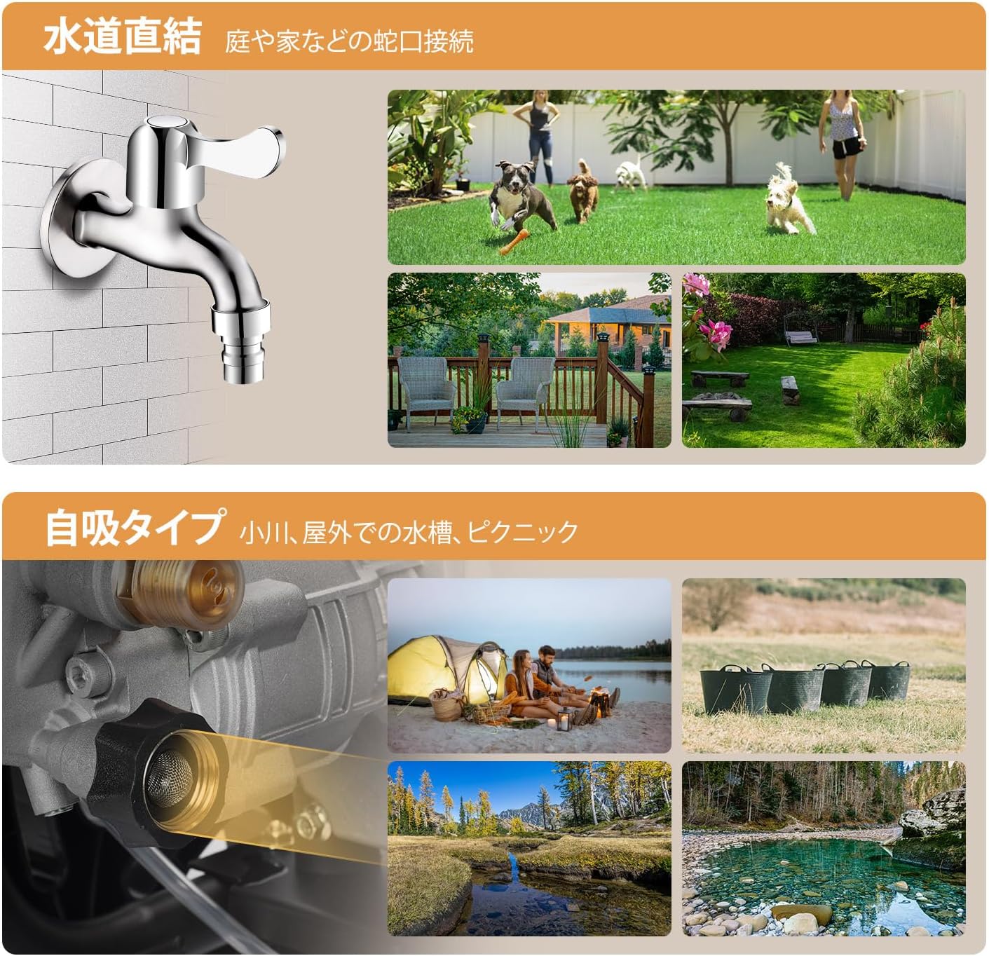 Image: Illustrates two water connection methods: direct connection to a faucet and self-suction from an external water source like a bucket or natural body of water.