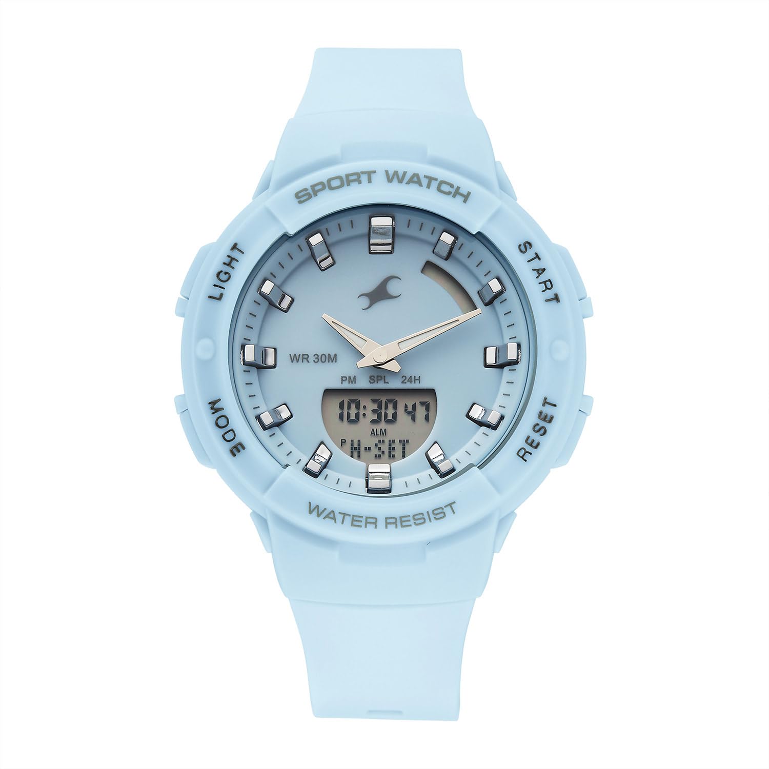 Mberi view of the Fastrack StreetStyle 5.0 watch, showcasing the blue dial, analog hands, and digital display. The four control buttons (LIGHT, MODE, START, RESET) are visible on the sides of the case.